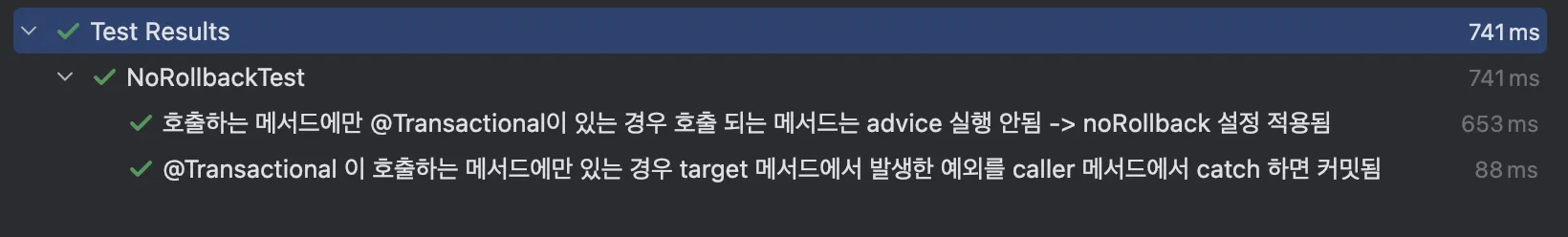 @DisplayName("호출하는 메서드에만 @Transactional이 있는 경우 호출 되는 메서드는 advice 실행 안됨 -> noRollback 설정 적용됨")